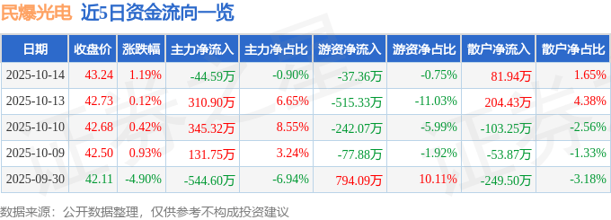 证券之星消息,截至2025年10月14日收盘,民爆光电(301362)报收于43.24元,上涨1.19%,换手率3.9%,成交量1.16万手,成交额4965.98万元。