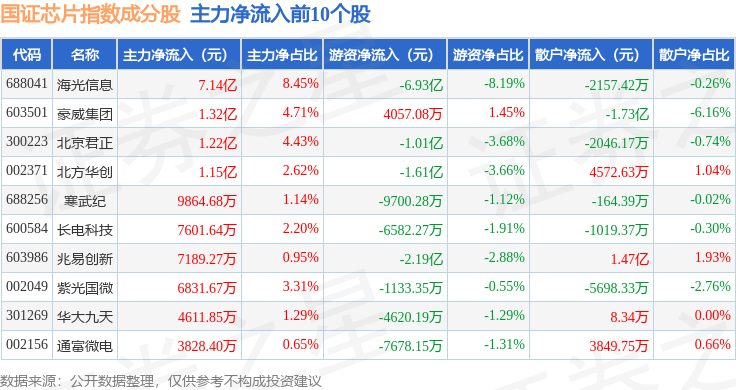 资金流向方面,国证芯片(980017)指数成份股当日主力资金净流出合计17.17亿元,游资资金净流入合计778.84万元,散户资金净流入合计17.1亿元。成份股资金流向详情见下表: