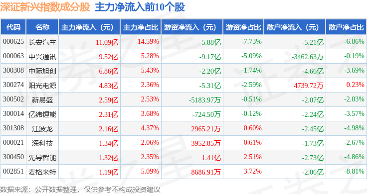 资金流向方面,深证新兴(399641)指数成份股当日主力资金净流出合计94.03亿元,游资资金净流入合计24.18亿元,散户资金净流入合计69.84亿元。成份股资金流向详情见下表: