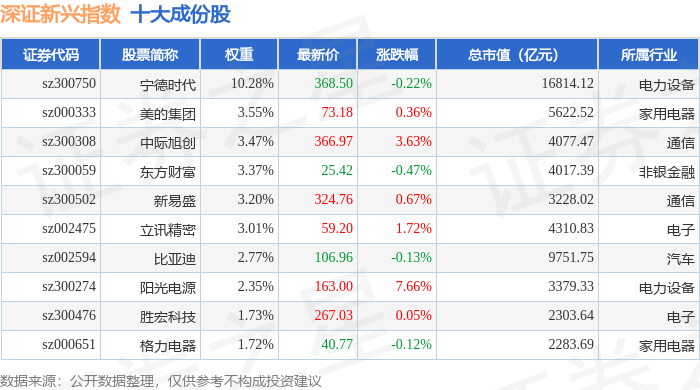 证券之星消息,10月16日,深证新兴(399641)指数报收于2733.67点,涨0.05%,成交3696.3亿元,换手率2.19%。当日该指数成份股中,上涨的有58家,阳光电源以7.66%的涨幅领涨,下跌的有139家,利欧股份以7.05%的跌幅领跌。