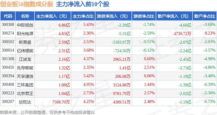 资金流向方面,创业板50(399673)指数成份股当日主力资金净流出合计22.14亿元,游资资金净流入合计16.72亿元,散户资金净流入合计5.41亿元。成份股资金流向详情见下表: