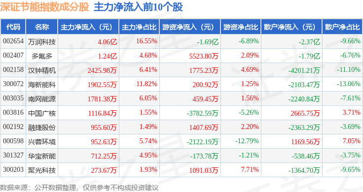 资金流向方面,深证节能(399695)指数成份股当日主力资金净流出合计148.07亿元,游资资金净流入合计27.79亿元,散户资金净流入合计120.28亿元。成份股资金流向详情见下表: