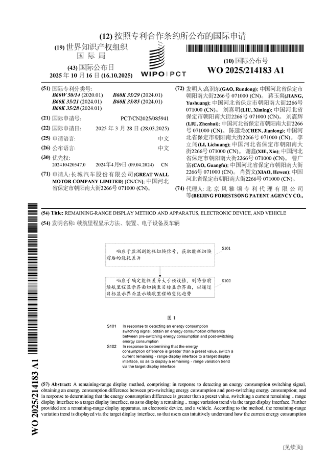 证券之星消息,根据企查查数据显示长城汽车(601633)公布了一项国际专利申请,专利名为“续航里程显示方法、装置、电子设备及车辆”,专利申请号为PCT/CN2025/085941,国际公布日为2025年10月16日。