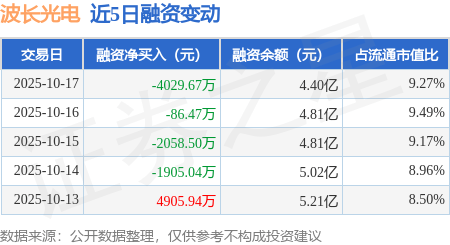 证券之星消息,10月17日,波长光电(301421)融资买入5808.09万元,融资偿还9837.76万元,融资净卖出4029.67万元,融资余额4.4亿元,近20个交易日中有11个交易日出现融资净买入。