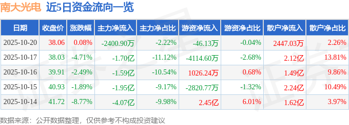 证券之星消息,截至2025年10月20日收盘,南大光电(300346)报收于38.06元,上涨0.08%,换手率4.28%,成交量28.12万手,成交额10.81亿元。