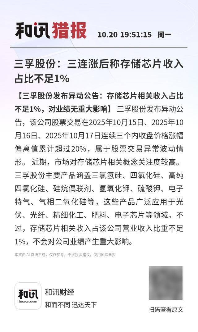 【三孚股份发布异动公告:存储芯片相关收入占比不足1%,对业绩无重大影响】三孚股份发布异动公告,该公司股票交易在2025年10月15日、2025年10月16日、2025年10月17日连续三个内收盘价格涨幅偏离值累计超过20%,属于股票交易异常波动情形。 近期,市场对存储芯片相关概念关注度较高。三孚股份主要产品涵盖三氯氢硅、四氯化硅、高纯四氯化硅、硅烷偶联剂、氢氧化钾、硫酸钾、电子特气、气相二氧化硅等,这些产品广泛应用于光伏、光纤、精细化工、肥料、电子芯片等领域。不过,存储芯片相关收入占该公司营业收入比重不足1%,不会对公司业绩产生重大影响。
