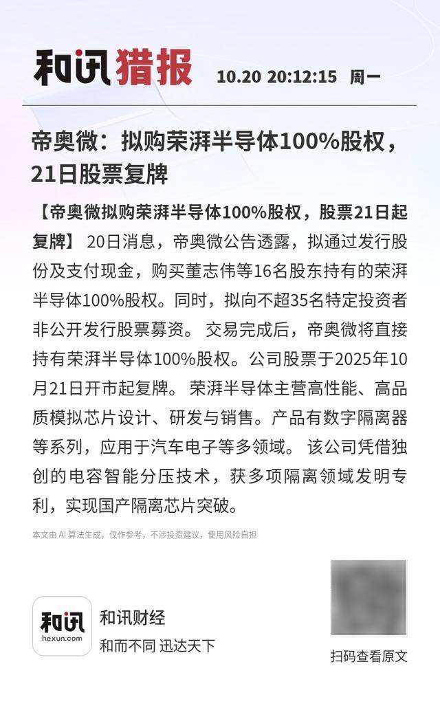 【帝奥微拟购荣湃半导体100%股权,股票21日起复牌】20日消息,帝奥微公告透露,拟通过发行股份及支付现金,购买董志伟等16名股东持有的荣湃半导体100%股权。同时,拟向不超35名特定投资者非公开发行股票募资。 交易完成后,帝奥微将直接持有荣湃半导体100%股权。公司股票于2025年10月21日开市起复牌。 荣湃半导体主营高性能、高品质模拟芯片设计、研发与销售。产品有数字隔离器等系列,应用于汽车电子等多领域。 该公司凭借独创的电容智能分压技术,获多项隔离领域发明专利,实现国产隔离芯片突破。