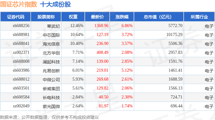 证券之星消息,10月21日,国证芯片(980017)指数报收于13047.13点,涨3.32%,成交1027.98亿元,换手率3.98%。当日该指数成份股中,上涨的有30家,闻泰科技以9.99%的涨幅领涨。