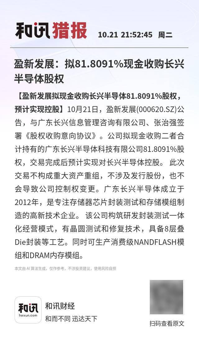【盈新发展拟现金收购长兴半导体81.8091%股权,预计实现控股】10月21日,盈新发展(000620.SZ)公告,与广东长兴信息管理咨询有限公司、张治强签署《股权收购意向协议》。公司拟现金收购二者合计持有的广东长兴半导体科技有限公司81.8091%股权,交易完成后预计实现对长兴半导体控股。 此次交易不构成重大资产重组,不涉及发行股份,也不会导致公司控制权变更。广东长兴半导体成立于2012年,是专注存储器芯片封装测试和存储模组制造的高新技术企业。 该公司构筑研发封装测试一体化经营模式,有晶圆测试和修复技术,具备8层叠Die封装等工艺。同时可生产消费级NANDFLASH模组和DRAM内存模组。