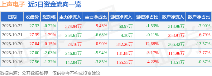证券之星消息,截至2025年10月22日收盘,上声电子(688533)报收于27.33元,下跌0.22%,换手率0.89%,成交量1.45万手,成交额3975.31万元。