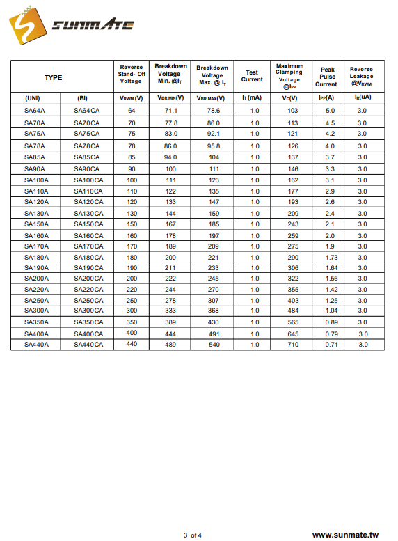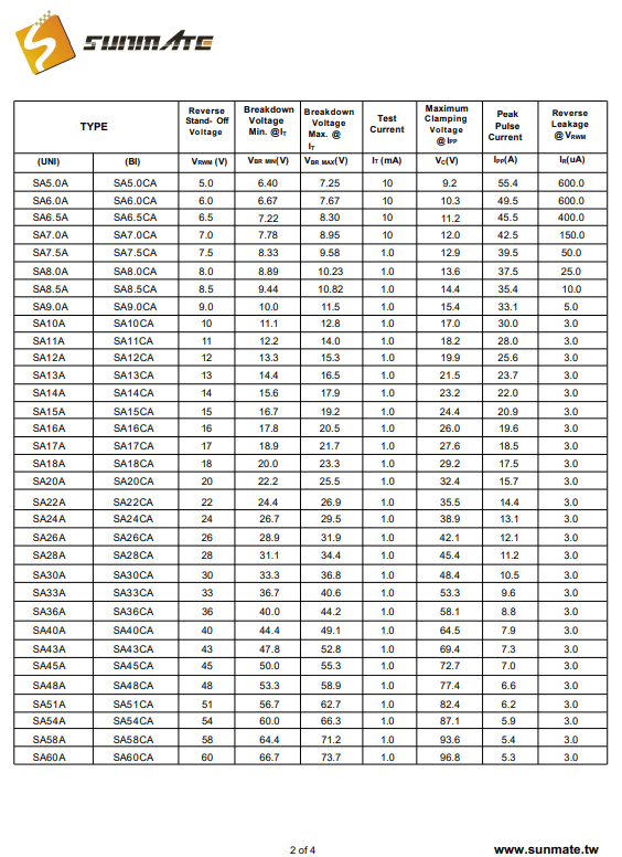 SA45A单向 TVS瞬态抑制二极管,生产商: SUNMATE/森美特