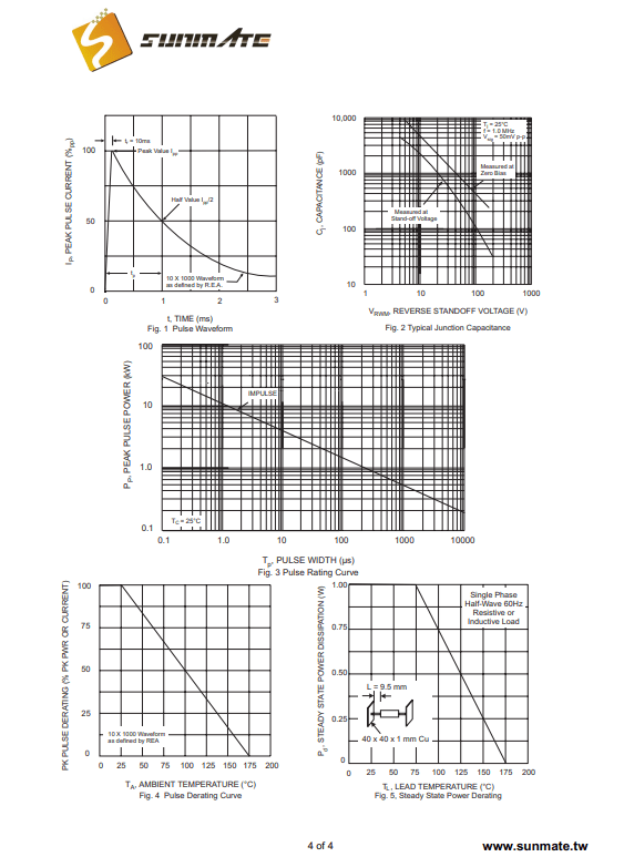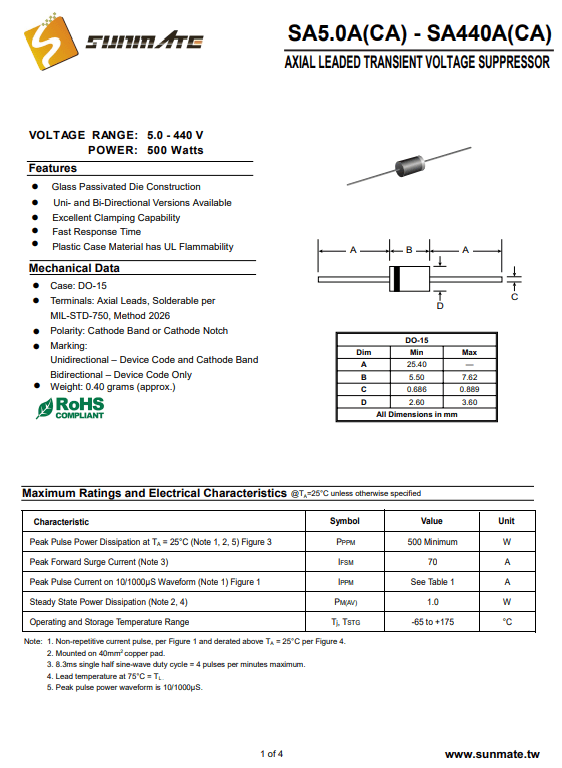 500W峰值脉冲功率能力,a10/10004波,重复率(dutycycle):0.01%高温焊接保证:260*C/10秒