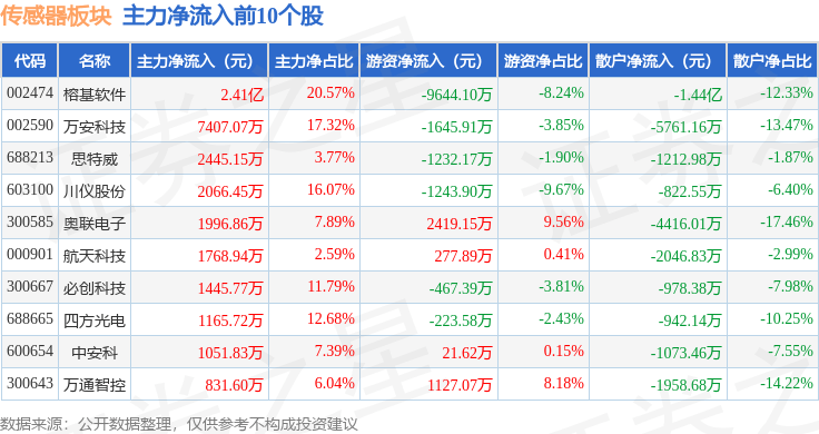 从资金流向上来看,当日传感器板块主力资金净流出27.29亿元,游资资金净流入6.36亿元,散户资金净流入20.94亿元。传感器板块个股资金流向见下表:
