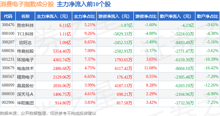 资金流向方面,消费电子(980030)指数成份股当日主力资金净流出合计21.34亿元,游资资金净流出合计7504.99万元,散户资金净流入合计22.09亿元。成份股资金流向详情见下表: