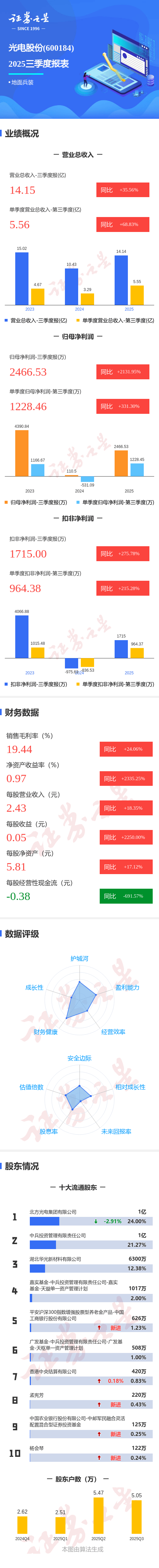 证券之星消息,光电股份2025年三季报显示,公司主营收入14.15亿元,同比上升35.56%;归母净利润2466.53万元,同比上升2131.96%;扣非净利润1715.0万元,同比上升275.78%;其中2025年第三季度,公司单季度主营收入5.56亿元,同比上升68.84%;单季度归母净利润1228.46万元,同比上升331.3%;单季度扣非净利润964.38万元,同比上升215.28%;负债率33.15%,投资收益1155.96万元,财务费用-456.44万元,毛利率19.44%。