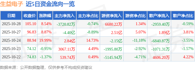 证券之星消息,截至2025年10月28日收盘,生益电子(688183)报收于105.1元,上涨8.54%,换手率5.86%,成交量48.73万手,成交额50.01亿元。
