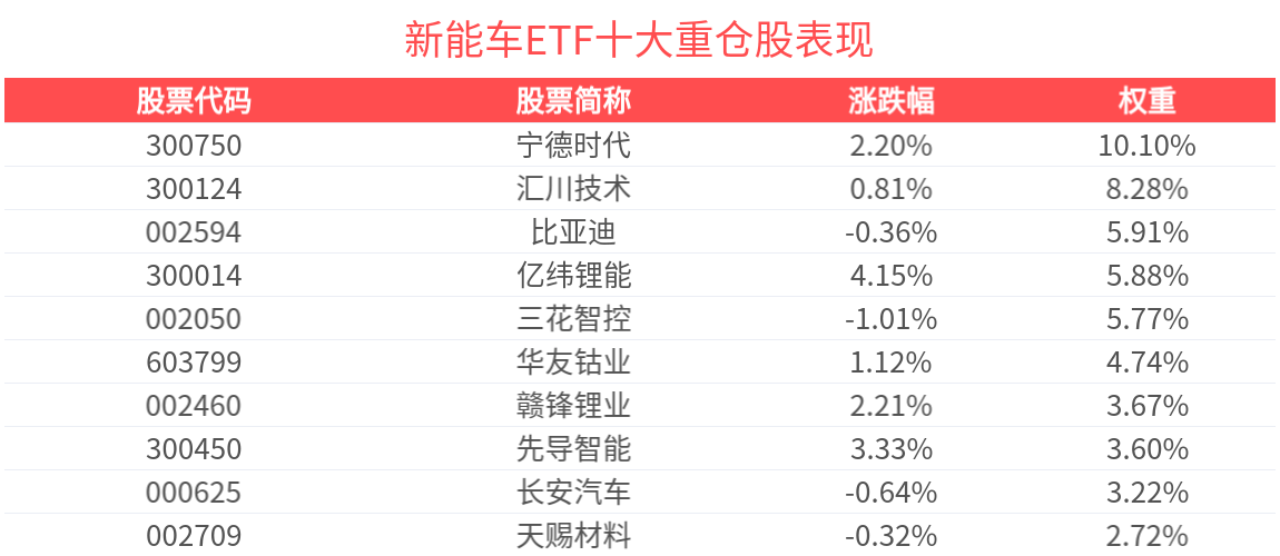 数据显示,截至2025年9月30日,中证新能源汽车产业指数(930997)前十大权重股分别为宁德时代(300750)、汇川技术(300124)、比亚迪(002594)、亿纬锂能(300014)、三花智控(002050)、华友钴业(603799)、赣锋锂业(002460)、先导智能(300450)、长安汽车(000625)、天赐材料(002709),前十大权重股合计占比54.61%。