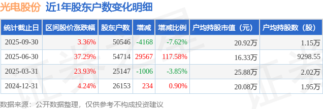 从股价来看,2025年6月30日至2025年9月30日,光电股份区间涨幅为3.36%,在此期间股东户数减少4168.0户,减幅为7.62%。