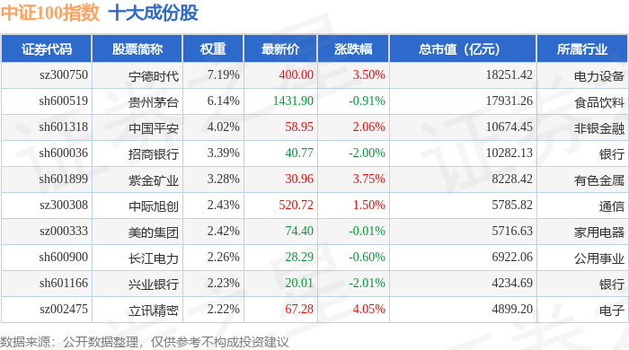 中证100(399903)指数十大成份股详情如下: