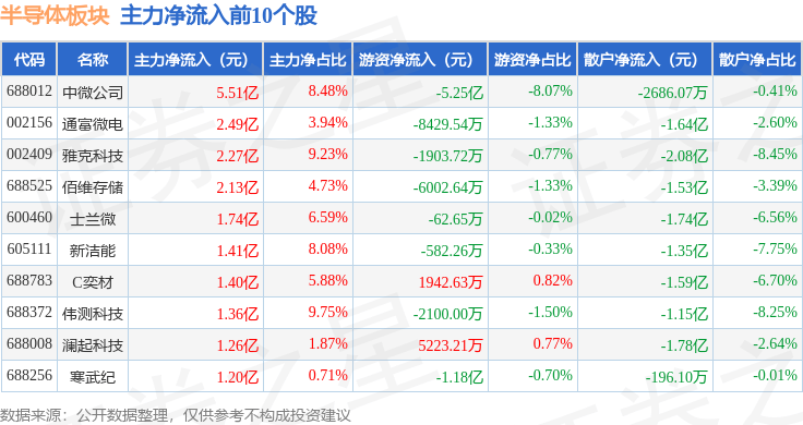 从资金流向上来看,当日半导体板块主力资金净流出95.92亿元,游资资金净流入50.55亿元,散户资金净流入45.37亿元。半导体板块个股资金流向见下表: