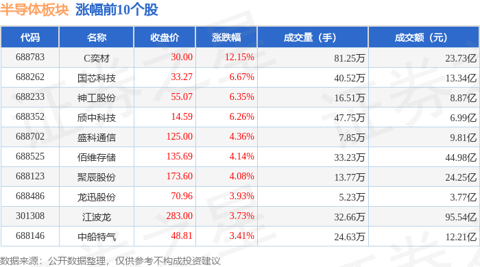 证券之星消息,10月30日半导体板块较上一交易日下跌2.07%,敏芯股份领跌。当日上证指数报收于3986.9,下跌0.73%。深证成指报收于13532.13,下跌1.16%。半导体板块个股涨跌见下表: