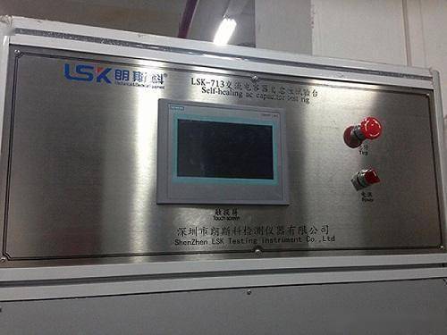 LSK713型电容器自愈试验台,按国家标准(GB/T17702.2-1999)试验要求设计,采用电感补偿,使输入电流减小,降低能耗及线路负荷;采用脉冲试验法探检电容器的自愈击穿次数,并自动记录自愈次数,及断电停机;全自动测试,西门子PLC彩色大触摸屏显示和操作;设备配有隔音良好的隔音盒,是适用于交流电容器自愈试验的专用设备。