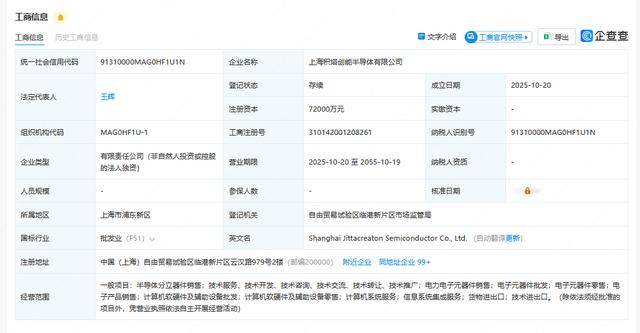 根据企查查数据显示,该新公司由上海积塔半导体有限公司全资控股,于2025年10月20日在上海市市场监督管理局登记成立,法定代表人为王辉。公司位于中国(上海)自由贸易试验区临港新片区云汉路979号2楼。