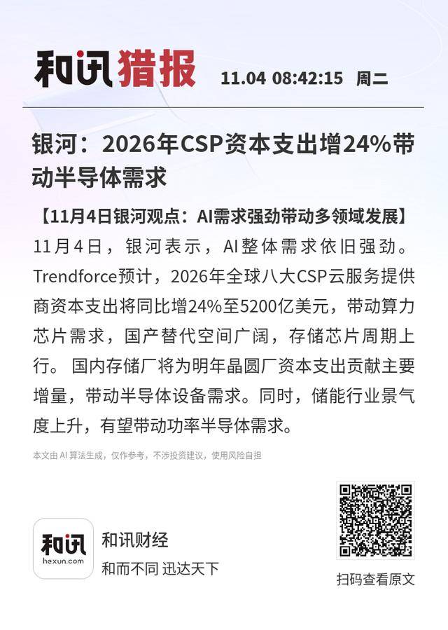 【11月4日银河观点:AI需求强劲带动多领域发展】11月4日,银河表示,AI整体需求依旧强劲。Trendforce预计,2026年全球八大CSP云服务提供商资本支出将同比增24%至5200亿美元,带动算力芯片需求,国产替代空间广阔,存储芯片周期上行。 国内存储厂将为明年晶圆厂资本支出贡献主要增量,带动半导体设备需求。同时,储能行业景气度上升,有望带动功率半导体需求。