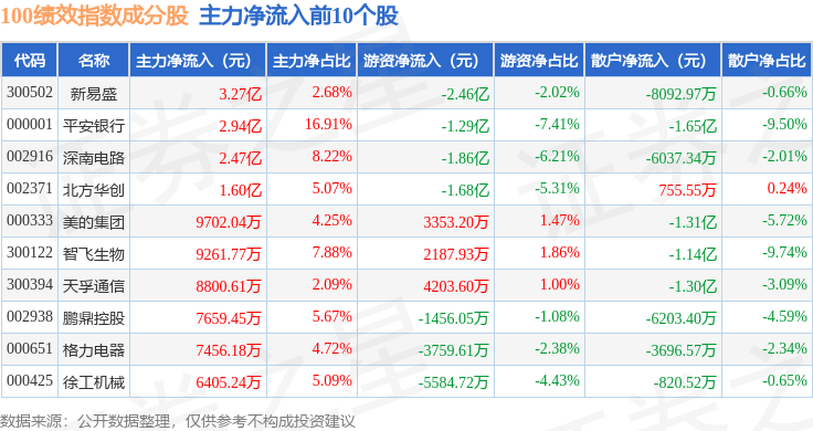 资金流向方面,100绩效(399656)指数成份股当日主力资金净流出合计160.54亿元,游资资金净流入合计41.44亿元,散户资金净流入合计119.09亿元。成份股资金流向详情见下表:
