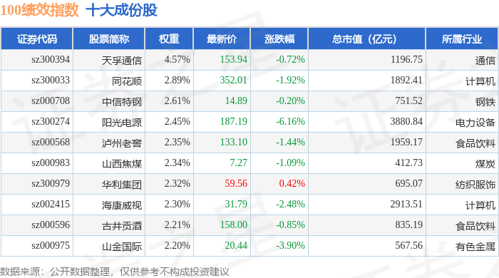 证券之星消息,11月4日,100绩效(399656)指数报收于6393.9点,跌1.4%,成交2040.62亿元,换手率1.09%。当日该指数成份股中,上涨的有17家,思源电气以5.07%的涨幅领涨,下跌的有83家,阳光电源以6.16%的跌幅领跌。