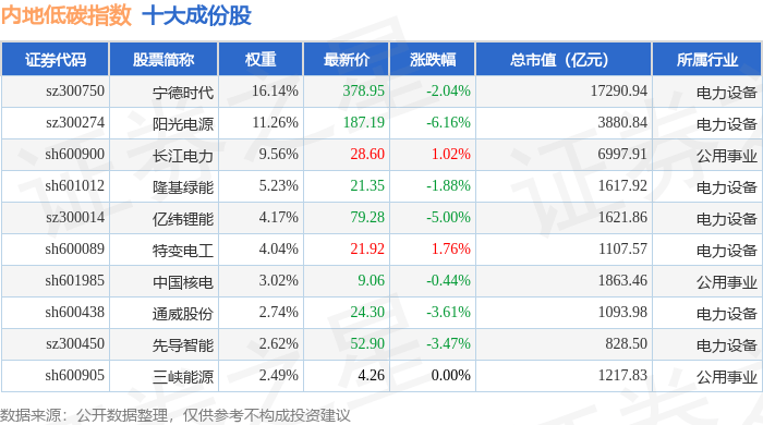 证券之星消息,11月4日,内地低碳(000977)指数报收于2176.82点,跌2.2%,成交1013.41亿元,换手率1.3%。当日该指数成份股中,上涨的有9家,阿特斯以1.96%的涨幅领涨,下跌的有39家,阳光电源以6.16%的跌幅领跌。