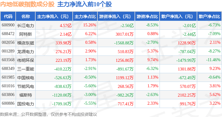 资金流向方面,内地低碳(000977)指数成份股当日主力资金净流出合计85.37亿元,游资资金净流入合计25.42亿元,散户资金净流入合计59.95亿元。成份股资金流向详情见下表:
