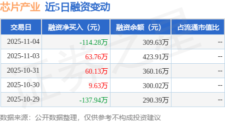 证券之星消息,11月4日,芯片产业(159310)融资买入41.08万元,融资偿还155.36万元,融资净卖出114.28万元,融资余额309.63万元。