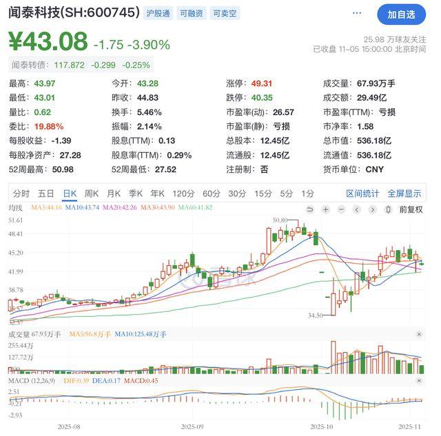 截至11月5日收盘,闻泰科技股价跌3.9%,报收43.08元/股,总市值536.18亿元。若按照43.08元/股计算,无锡国联集成电路投资中心此次套现金额大约16亿元。