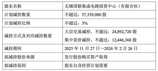 11月5日晚间,闻泰科技600745)公告称,持股5%以上股东无锡国联集成电路投资中心(有限合伙)计划通过大宗交易方式减持不超过2489.27万股(不超过公司总股本的2%)、通过集中竞价方式减持不超过1244.64万股(不超过公司总股本的1%),合计减持不超过3733.91万股,即不超过公司总股本的3%。