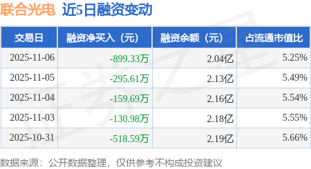 证券之星消息,11月6日,联合光电(300691)融资买入702.97万元,融资偿还1602.31万元,融资净卖出899.33万元,融资余额2.04亿元。