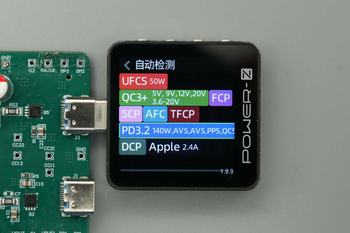 使用ChargerLAB POWER-Z KM003C测得输出端C1接口支持UFCS、PD3.2、FCP、SCP、AFC、QC3+、DCP、AFC、Apple 2.4A等快充协议。