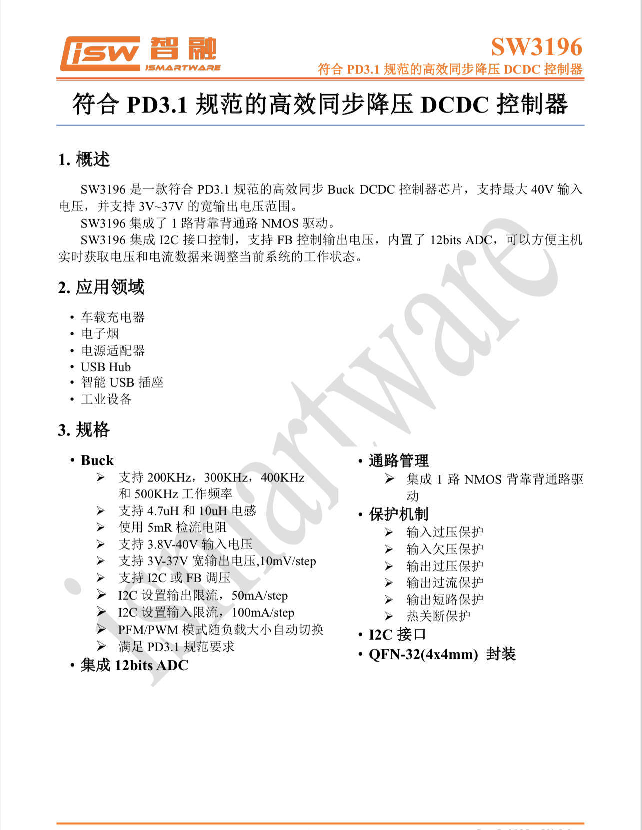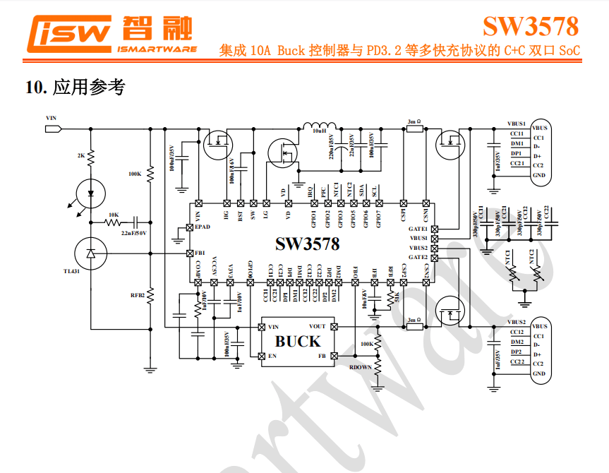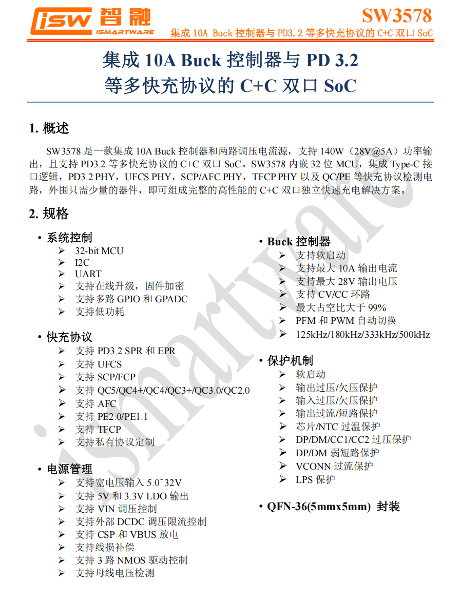 SW3578 是一款面向双 USB-C 口快充应用的高集成 SoC,内部集成32bit MCU 并集成 双路独立的Type-C 逻辑,支持 PD3.2 SPR AVS、PD3.2 EPR AVS、UFCS、SCP/FCP、QC5/4+/4/3+/3.0/2.0、AFC、PE2.0/1.1、TFCP 等多种快充协议,并支持私有协议定制。