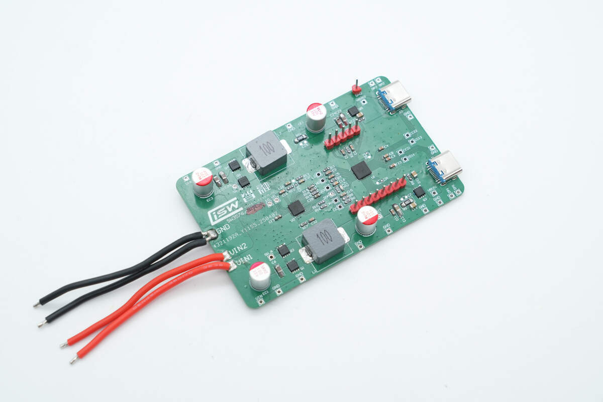 该方案由 SW3578+SW3196 组成的双C独立140W应用方案,同时周边布置电感、电容及若干保护元件,形成完整的降压与协议控制电路。从方案表面可以看到两个大功率电感与多颗固态电容分布在两侧,分别对应两路独立的输出通道,保证在大电流工作时仍能维持良好的稳定性与低纹波输出。