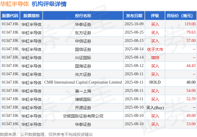 投行对该股的评级以买入为主,近90天内共有9家投行给出买入评级,近90天的目标均价为61.86港元。华泰证券最新一份研报给予华虹半导体买入评级,目标价119港元。