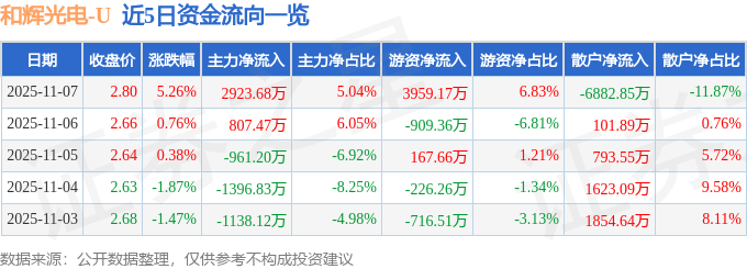11月7日的资金流向数据方面,主力资金净流入2923.68万元,占总成交额5.04%,游资资金净流入3959.17万元,占总成交额6.83%,散户资金净流出6882.85万元,占总成交额11.87%。