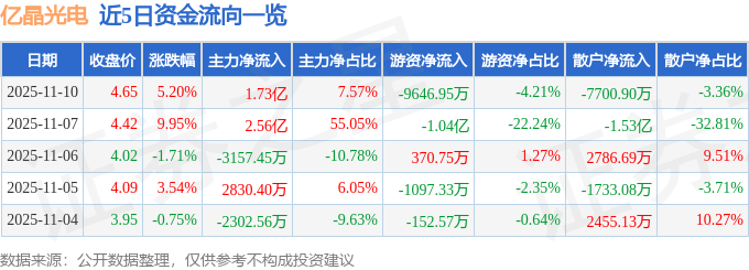 证券之星消息,截至2025年11月10日收盘,亿晶光电(600537)报收于4.65元,上涨5.2%,换手率41.16%,成交量487.21万手,成交额22.93亿元。