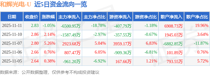 11月11日的资金流向数据方面,主力资金净流出6500.95万元,占总成交额18.78%,游资资金净流出407.79万元,占总成交额1.18%,散户资金净流入6908.73万元,占总成交额19.96%。