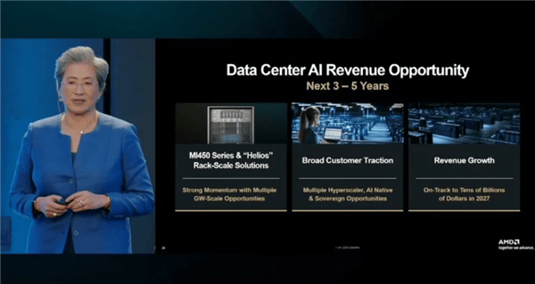 她预计,未来三到五年,AMD的年均营收复合增长率(CAGR)将超过35%,其中AI数据中心营收平均增长将高达80%。