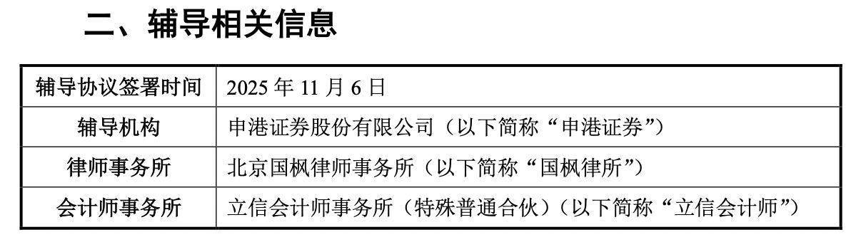 本次IPO的辅导机构为申港证券股份有限公司,律师事务所为北京国枫律师事务所,会计师事务所为立信会计师事务所(特殊普通合伙)。