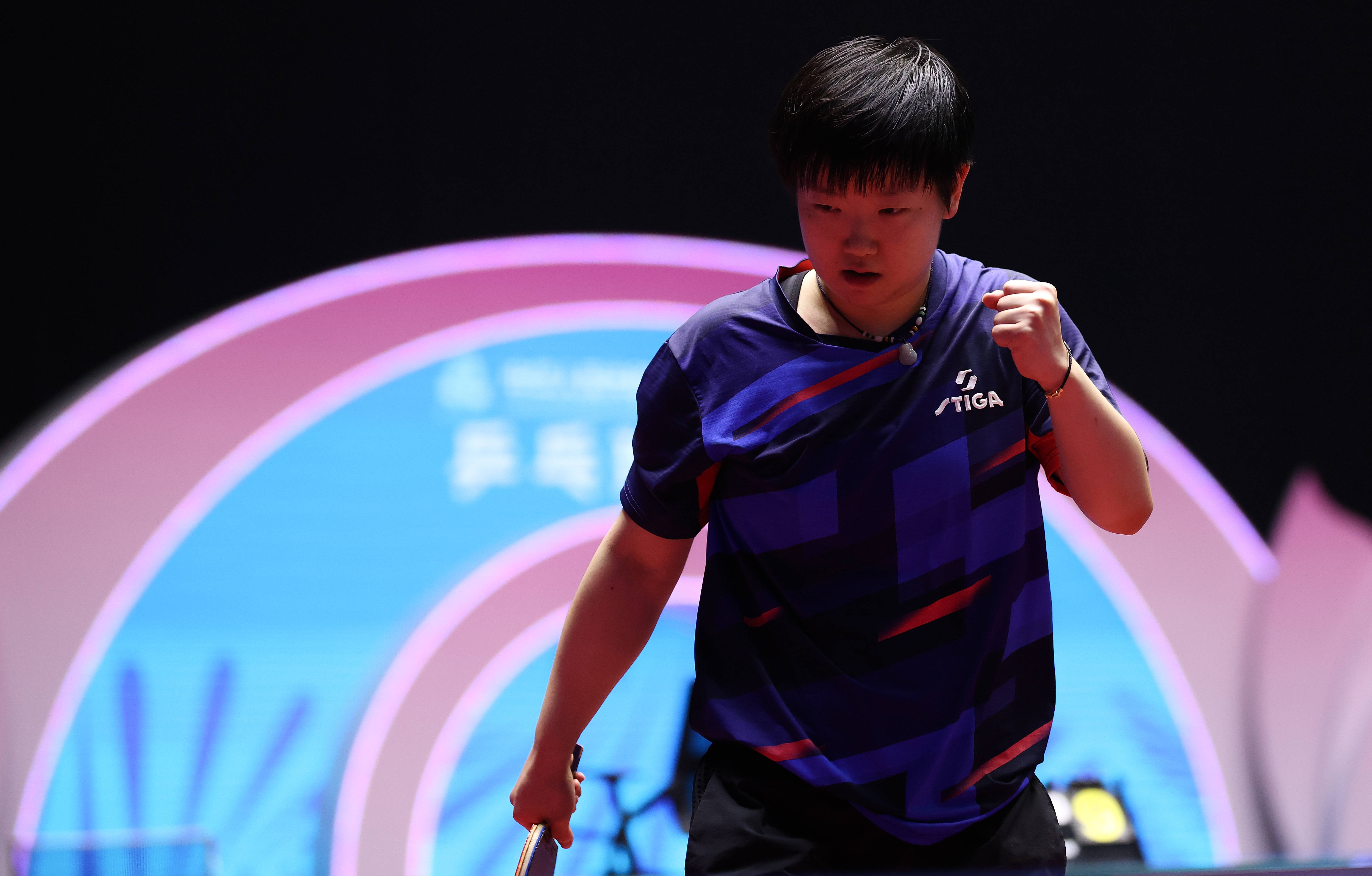 11月13日,河北队选手孙颖莎在比赛中庆祝得分。 新华社记者 梁旭 摄