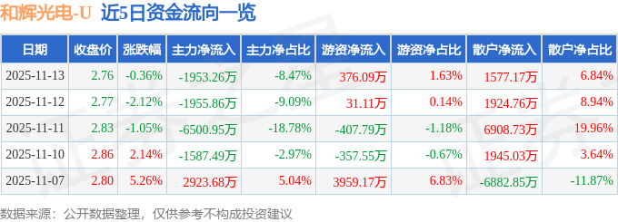 证券之星消息,截至2025年11月13日收盘,和辉光电(688538)报收于2.76元,下跌0.36%,换手率1.45%,成交量83.68万手,成交额2.31亿元。