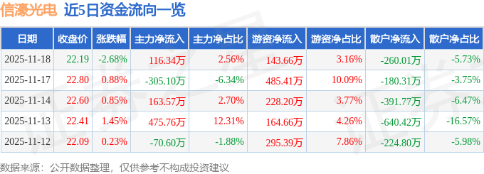 证券之星消息,截至2025年11月18日收盘,信濠光电(301051)报收于22.19元,下跌2.68%,换手率1.26%,成交量2.03万手,成交额4541.58万元。