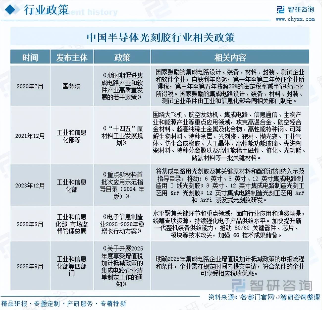 光刻胶作为半导体制造的核心功能性材料,其发展一直受到国家政策的大力支持。近年来,我国围绕集成电路与新材料产业构建了多层次、全方位的政策体系,先后出台《新时期促进集成电路产业和软件产业高质量发展的若干政策》《“十四五”原材料工业发展规划》《重点新材料首批次应用示范指导目录(2024年版)》《电子信息制造业2025-2026年稳增长行动方案》以及《关于开展2025年度享受增值税加计抵减政策的集成电路企业清单制定工作的通知》等关键文件。这些政策从产业规划、财税支持、应用推广、技术攻关等多个维度协同发力,不仅将光刻胶明确列为重点突破的新材料,还通过税收减免、首台套保险补偿、示范应用牵引等机制,为半导体光刻胶行业的技术研发、产能建设和下游导入提供了系统性保障,有力推动了行业从技术攻关到产业化应用的加速发展。