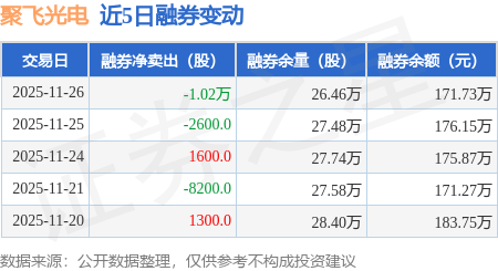 证券之星消息,11月26日,聚飞光电(300303)融资买入1722.75万元,融资偿还1537.19万元,融资净买入185.56万元,融资余额6.76亿元。